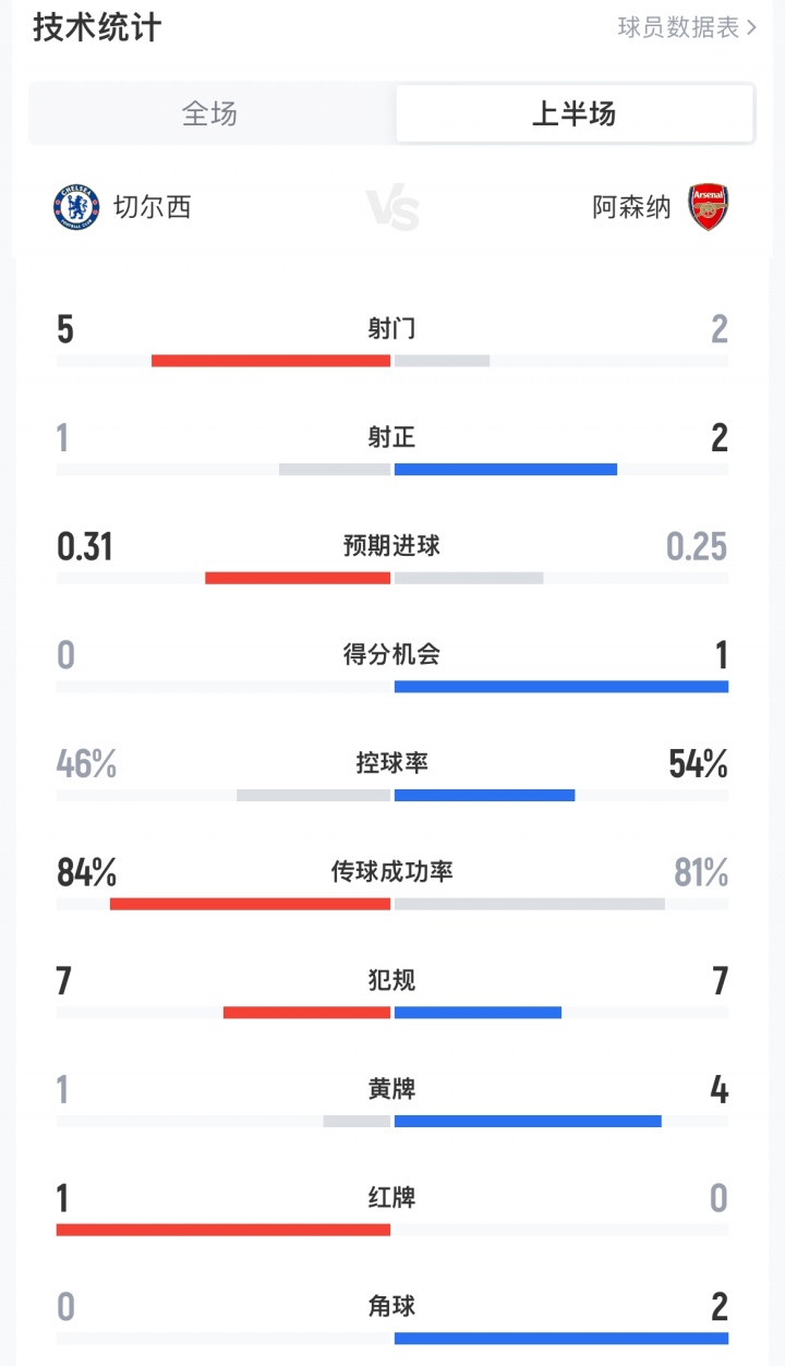 12月01日讯 英超第13轮,十人切尔西半场暂0-0阿森纳,半场数据如下↓